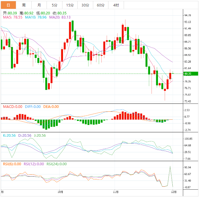当前布林带处于开口期,MA均线走出双金叉,KDJ随机指标三线向下,到达超买,MACD指标红色动能柱小幅缩量,快慢线金叉向前,综合来看,日内建议高空低多,上方关注82.0-82.5附近阻力,下方关注78.5-79.0附近支撑。