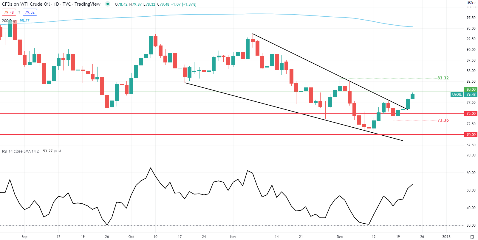 每日WTI原油价格走势成功维持了昨天看到的下降楔形(黑色)突破,现在看起来正在测试心理阻力位80美元/桶。相对强弱指数(RSI)最近突破了50的中点,表明看涨势头偏好。美国GDP数据将是今天的关键,应该会为这种上行势头是否会持续提供短期的方向性偏见。