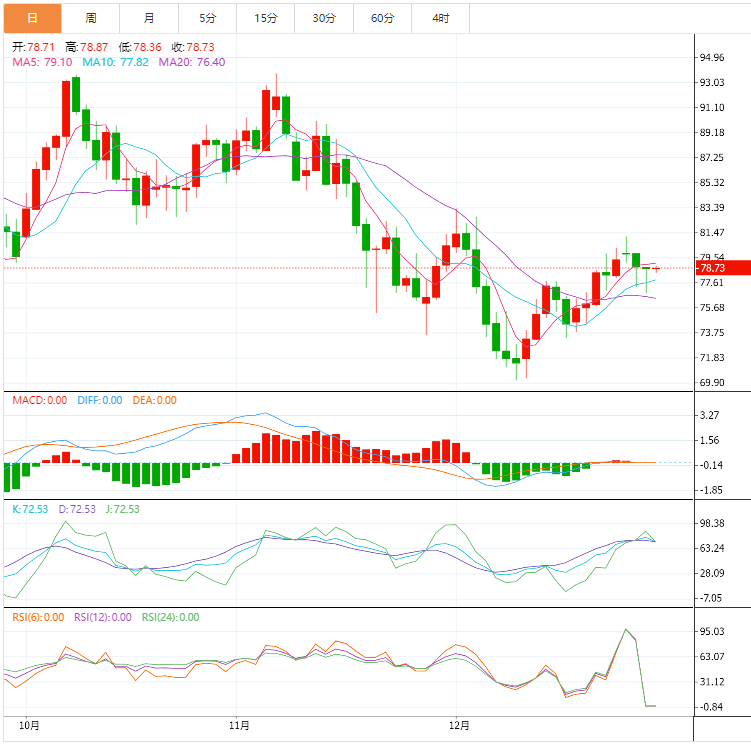 周五亚洲时段,美油交投于78.73美元/桶;油价周四连续第二个交易日下跌,受累于需求前景不确定,上周美国原油库存意外增加也拖累油价,Kpler首席石油分析师MattSmith表示:“原油在稀疏的交易中步履蹒跚地走向年底,美国能源信息署(EIA)的报告良好,没有什么能激发原油多头或空头的动力。”