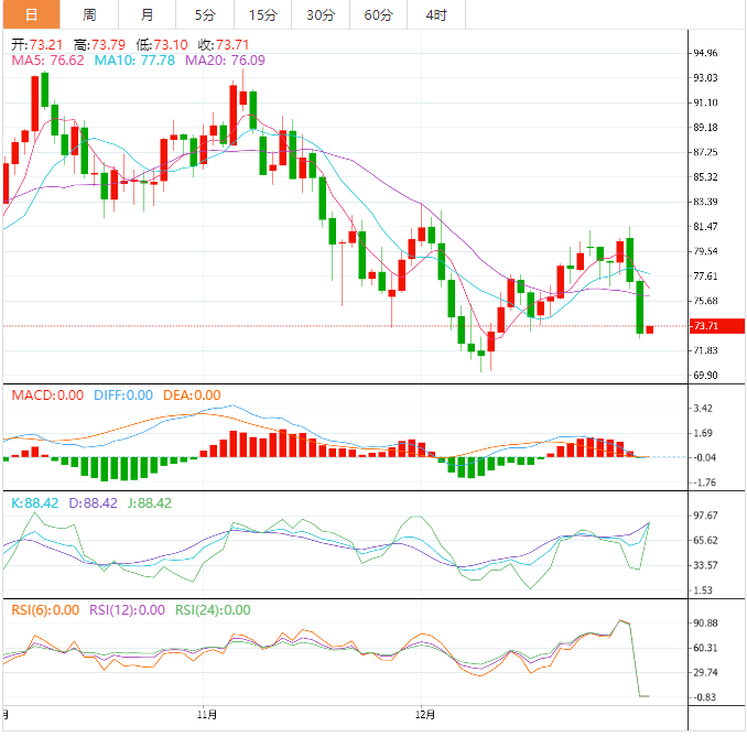 四小时周期看布林带收口运行,K线当前在下轨支撑附近运行,MA5以及MA10均线高位开始拐头向下运行状态,MACD能量柱缩减走势,KDJ指标死叉,高位压力非常强大,冲高回落走势,先看压力位置下跌。建议以反弹做空为主,回踩低多为辅,上方短期关注75.2-75.7一线阻力,下方短期关注71.5-71.0一线支撑。