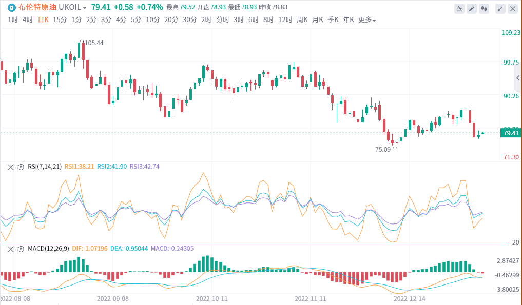 目前的横盘走势表明形成了一个临时的底部或一个延续的模式。突破79.65美元/桶可能导致进入81.05—82.46美元/桶的区间,而跌破77.92美元/桶可能为通往75.11美元/桶开辟道路。