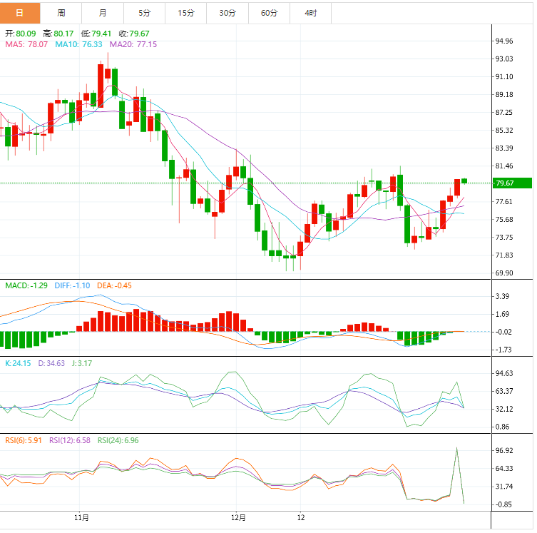周一亚洲时段,原油交投于79.869附近。油价上周五结算时每桶上涨超过1美元,本周创下自10月以来的最大周涨幅,因为美元跌至七个月低点,而且更多的指标显示最大石油进口国的需求在增长。石油输出国组织(OPEC)和包括俄罗斯在内的盟国,即OPEC+将在2月份举行会议,以评估市场状况,有人担心该组织可能在最近的油价下跌之后再次削减石油产量以提振价格。由于全球油价跌至每桶90美元以下,OPEC+曾在10月份宣布每天减产200万桶。