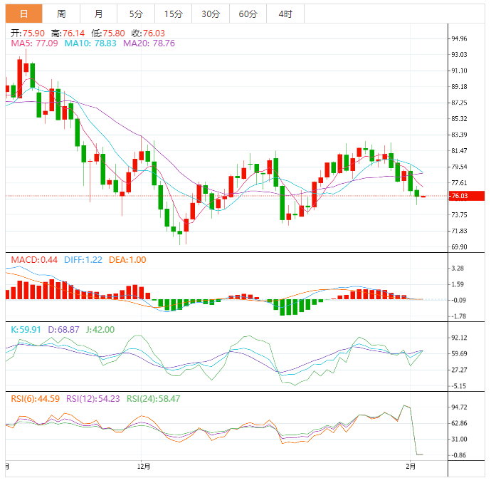 周五亚洲时段,美油交投于75.93美元/桶附近;油价周四下跌近1%,因美国与工业相关的工厂订单下滑,而美元走强拖累油价;而受冬季风暴影响,美国数百架次航班被取消,也推动了油价的下行风险。