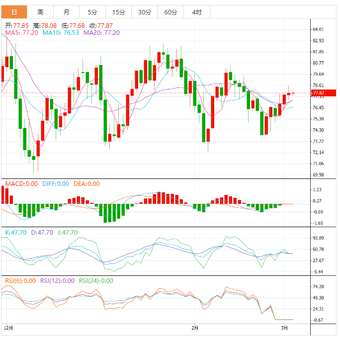 截止3月2日NYMEX 04月原油期货(CONJ)结算价78.16美元/桶,比前一交易日上涨0.47美元,涨幅0.6%,交易区间77.23-78.59美元/桶。国际衍生品智库分析师认为,油价连续上涨,受中美需求回暖提振,隔夜油价收于两周高点。