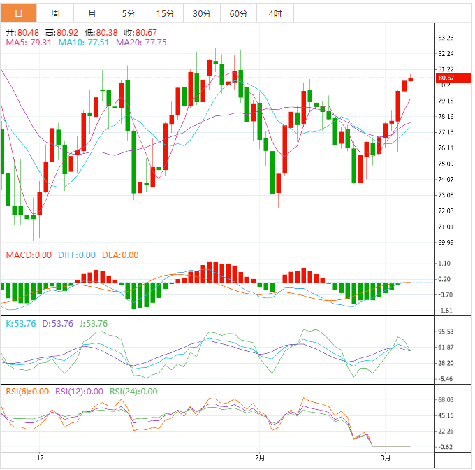 技术面上,目前结构处于震荡上升当中,上方首个阻力关注80.6其次是82.50.由于近期的迂回反复,加大了短线操作难度,主要是洗盘的过程中,区间难定,至少在亚盘难确定日内的空间持续性,尽量把时间点放到欧美盘, 多头临界点在上周五的低点75.80.短线回调先低多,空间边走边看。综合来看,今日原油短线建议以回踩低多为主,反弹高空为辅,上方短期关注82.0-82.5一线阻力,下方短期关注79.5-79.0一线支撑。