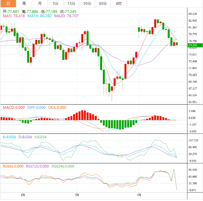 技术面上,MACD有死叉迹象,且红色柱萎缩殆尽,油价短线偏向空头,100日均线76.87附近也还分别存在一些支撑。鉴于下方21日均线仍向上发散,在失守21日均线前,多头也仍留有重拾涨势的机会。上方78.98已经转化为初步阻力所在,5日均线阻力在80.26附近,若能收复该位置,则削弱短线看空信号。