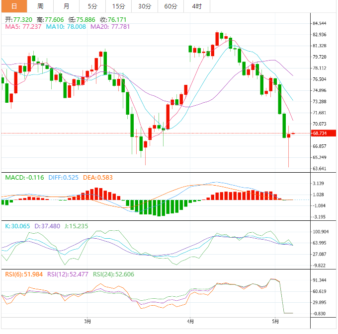 不过,油价尚未能收复前三天逾9%的跌幅,因市场对石油需求的担忧盖过了美国可能暂停加息的信号。5月3日,摩根士丹利将布伦特原油年底前的价格预测下调至75美元/桶。