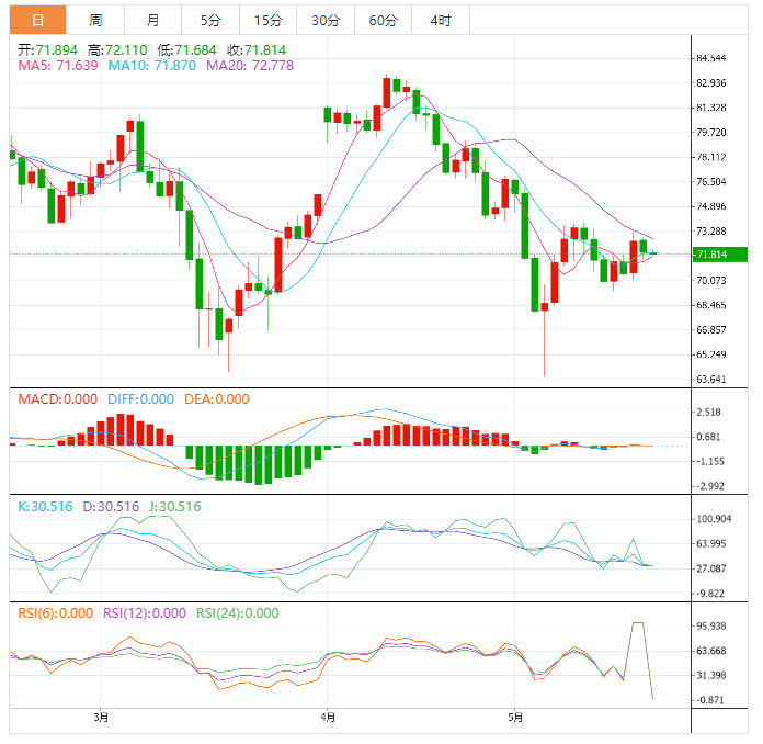 周五盘中,美原油交投于71.82美元/桶附近;油价周四下跌约1%,美国强劲的经济数据推动美元触及两个月最高,人们愈发预期美联储可能在6月再次加息。