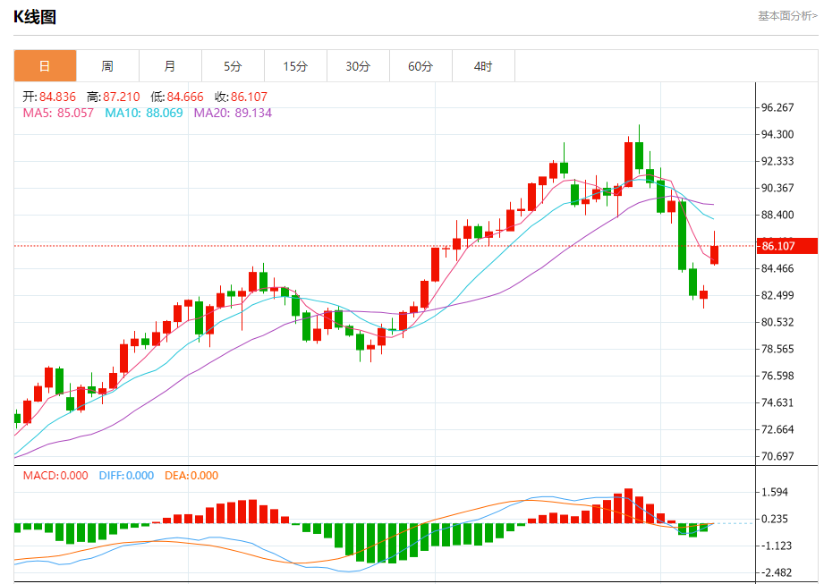 技术点评:在84.60之上,为多头信号,向上的目标位为87.25。