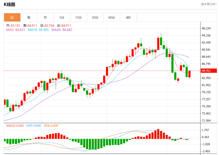 周四盘中,WTI原油报84.830,涨幅1.96%。