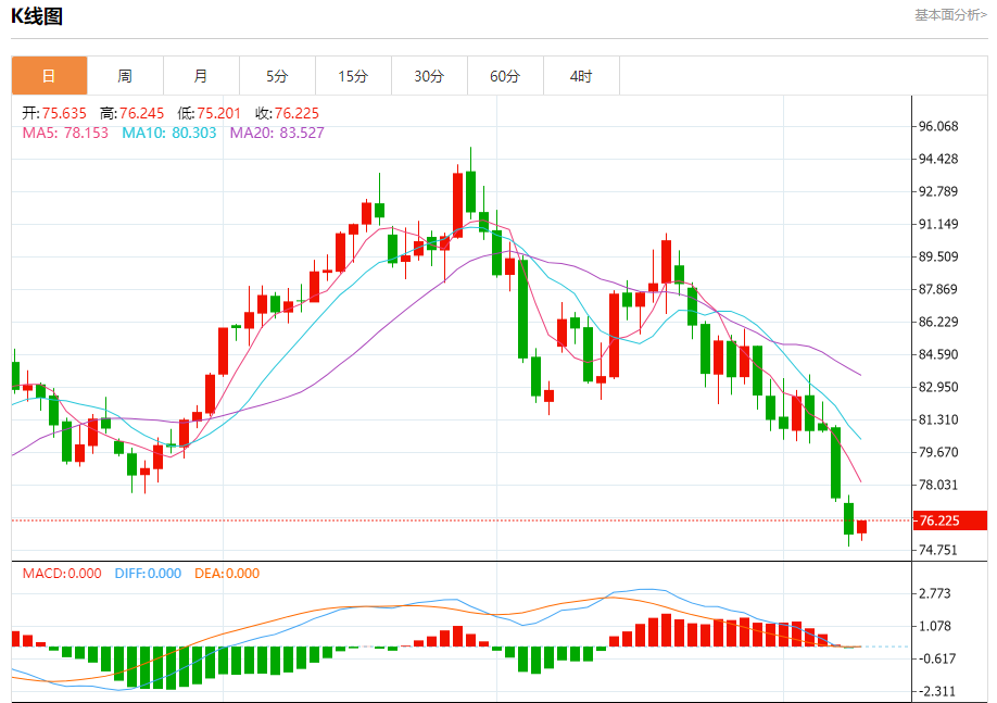 周四盘中,WTI原油报76.245,涨幅0.89%。