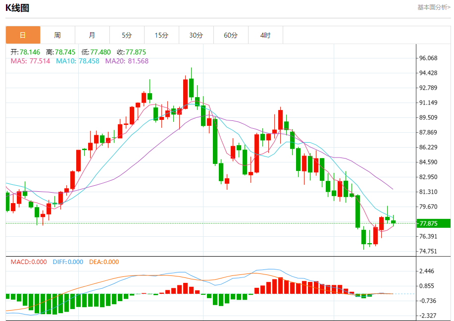 周三盘中,WTI原油报77.874,跌幅0.40%。