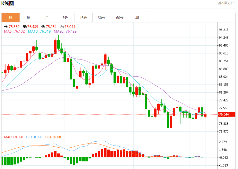 周五盘中,WTI原油报76.045,涨幅0.58%。