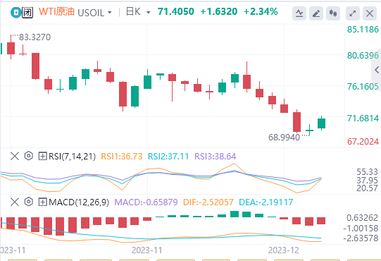 布伦特原油期货LCOc1结算价报每桶75.84美元,上涨1.79美元,涨幅为2.4%;美国原油期货CLc1结算价报71.23美元,上涨1.89美元,涨幅为2.7%。本周,这两大指标原油下跌3.8%,周四触及6月下旬以来最低,这表明许多交易商认为市场供过于求。此外,中国海关数据显示,由于库存高企、经济指标疲软以及独立炼厂订单放缓削弱需求,11月中国原油进口量同比下降9%,这也加剧了市场的跌势。