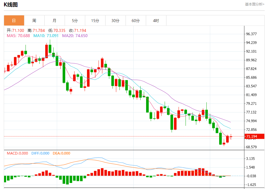 周一盘中,WTI原油报71.116,跌幅0.31%。