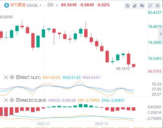 原油目前的交易价格为68.38美元,低于200天(76.23美元)和50天(79.08美元)的移动平均线,这表明了看跌趋势。
