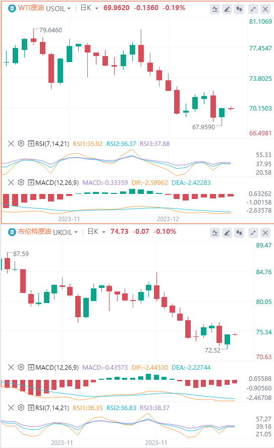 原油(WTI)价格似乎连续第二天上涨,在周四的亚洲交易日上涨了每桶70.00美元左右。在公布截至12月8日的一周美国环境影响评估原油库存变化,以及美联储(Fed)将利率维持在5.5%的利率决定后,原油价格上涨。EIA原油库存减少425.9万桶,比预期的65万桶多。截至目前,WTI原油报价69.96美元,Brent原油报价74.73美元。