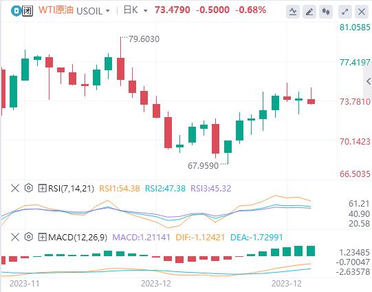 布伦特原油期货LCOc1下跌0.32美元,或0.4%,结算价报每桶79.07美元;美国原油期货CLc1下跌0.33美元,或0.5%,结算价报73.56美元。两大指标周线均上涨约3%,上周上涨不到1%。