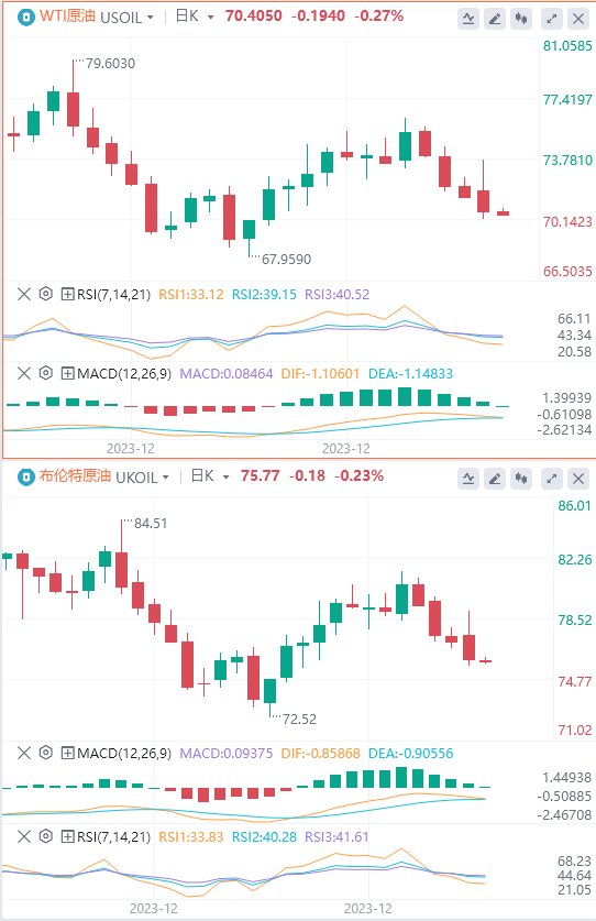 周三亚市,WTI油价交投于70.50美元附近。由于市场对美联储(Fed)降息的预期减弱,WTI油价上一交易日面临挑战。这种预期的转变归因于美国经济在2024年年底出现经济增长乏力的迹象。截至目前,WTI原油报价70.49美元,Brent原油报价75.77美元。