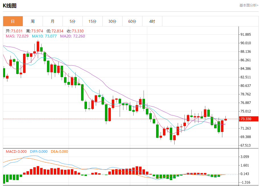 周四盘中,WTI原油报73.384,涨幅0.54%。