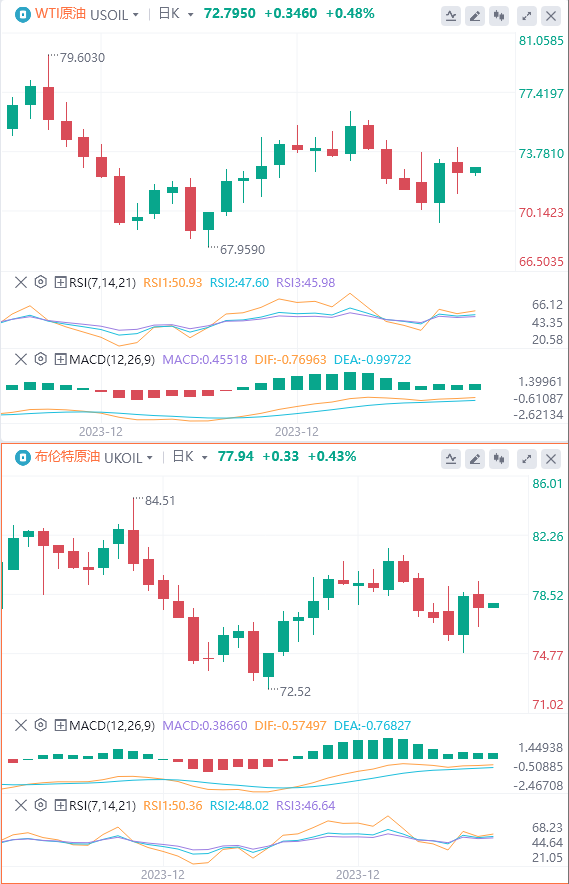 BOK Financial高级副总裁Dennis Kissler表示,红海地区的任何供应中断都可能导致WTI原油价格升至80.00美元附近。但如果没有中断的话,油价的均衡点似乎接近70.00美元区域。此外,原油价格通常会在一月中旬季节性走低分析师Vladimir Zernov表示,EIA库存数据后油价回调,汽油库存增长是主要的利空催化剂。从技术角度看,WTI 油价未能突破73.00-74.00美元的阻力位这对多头来说是个坏消息。布伦特油价如果跌破77.50美元,那么可能走向71.75-73.00美元的支撑位。
