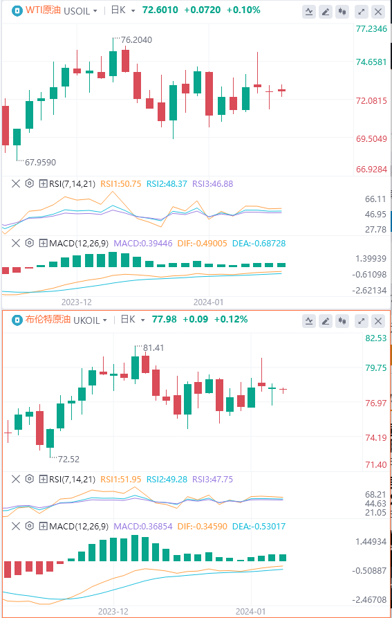 周一,由于适逢美国马丁·路德·金纪念日,WTI原油在交易中小幅下跌,期货市场并未像通常那样完全开放23小时。看起来我们正回到整体盘整的中期,考虑到市场对红海袭击、利率、地缘政治担忧、可能的经济衰退、美元等一系列问题都毫无头绪,这也是合情合理的。