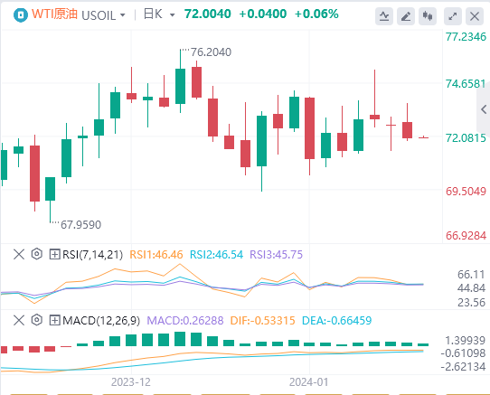 WTI原油较去年12月最低买盘67.97美元附近小幅上涨5.7%,上行复苏有限,仍较去年9月9月94.00美元附近的峰值下跌近24%。