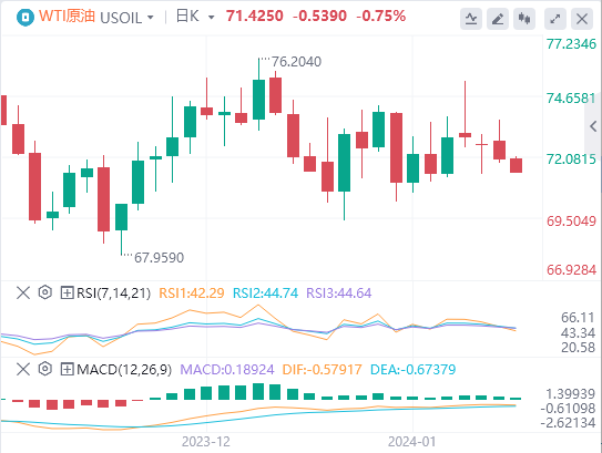 原油目前每日价格为71.42,略低于前一日收盘价72.40。将其与200天移动平均线76.78和50天移动平均线74.19进行比较,我们观察到价格低于这两个平均线。在支撑位和阻力位方面,需要关注的关键水平是72.48美元的枢轴。这个水平似乎控制着市场的近期方向。持续低于该水平的交易将是疲软的迹象。