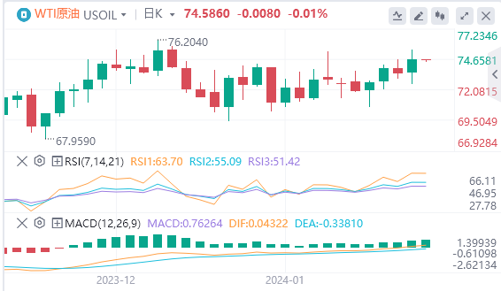 技术面:WTI原油周一自下而上攀升近4%,从72.55美元升至75.42美元,随着市场进入周二市场交易时段,价格回落至74.64美元。美国原油处于50天和200天简单移动平均线(SMA)之间的拥堵区域,介于78.00美元和73.00美元之间,在11月跌破200天简单移动平均线后进入窄幅盘整区间。