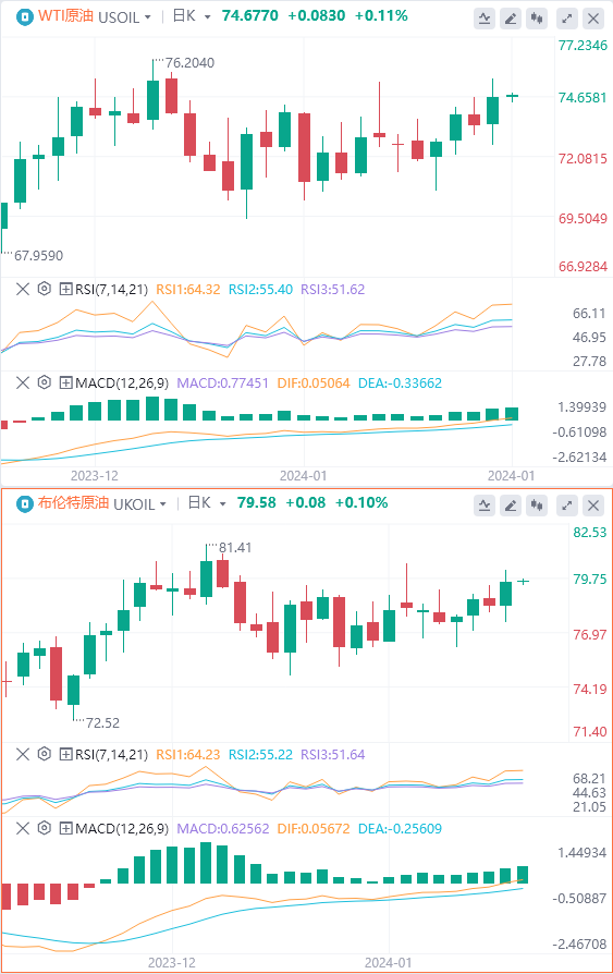 WTI原油昨天短暂突破75美元,达到75.11美元的高位。油价上次突破75美元水平是在1月12日,当时波动高点达到75.24美元。12月底高点达到75.66美元和76.18美元,这些水平是上方的多头目标。