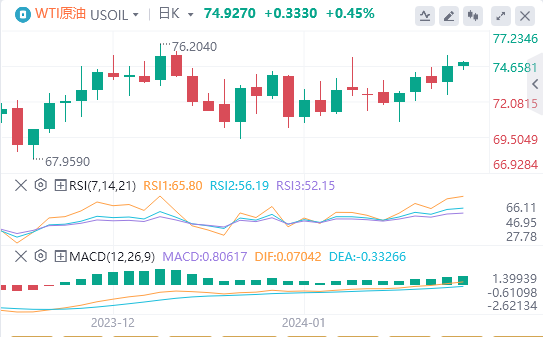目前原油价格为74.92,略高于前一交易日收盘价74.76,略有上行。该价格位于 50 天移动平均线 73.75 上方,表明潜在的短期看涨情绪。然而,它仍低于 200 日移动平均线 76.54,这可能表明长期看跌压力。