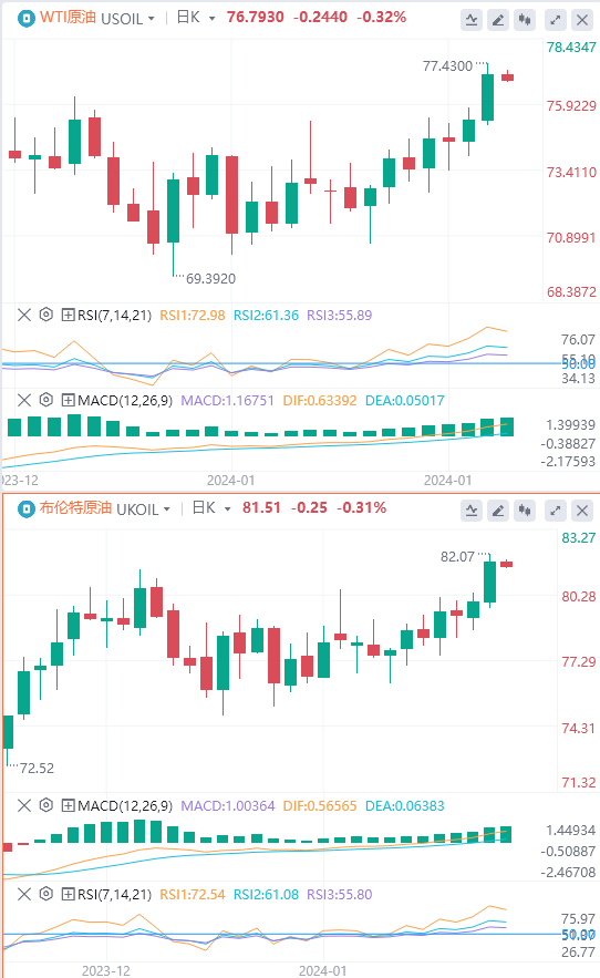 原油(WTI)油价暂停了连续两天的上涨,但预计本周将以积极的基调收盘,周五亚洲时段的交易价格接近每桶77.00美元。然而,原油价格获得了积极的势头,这在一定程度上归因于周四美国公布的好于预期的GDP年化(Q4)。截至目前,WTI原油报价76.79美元,Brent原油报价81.51美元。