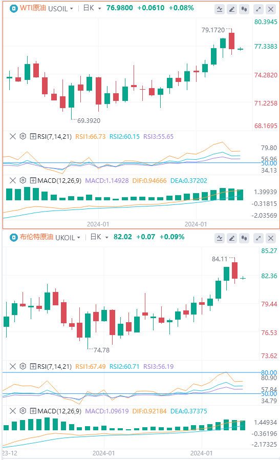 上周油价在技术驱动下上涨,突破了近期阻力位(WTI原油75.5,布油80水平),在胡塞武装袭击红海一艘油轮以及无人机袭击导致驻约旦美军人员死亡的消息传出后,油价回落。自去年12月初以来,当红海危机有可能蔓延到更广泛的地区时,市场一直在试图消化实际供应中断的风险,其结果是油价在回落之前出现暂时飙升。