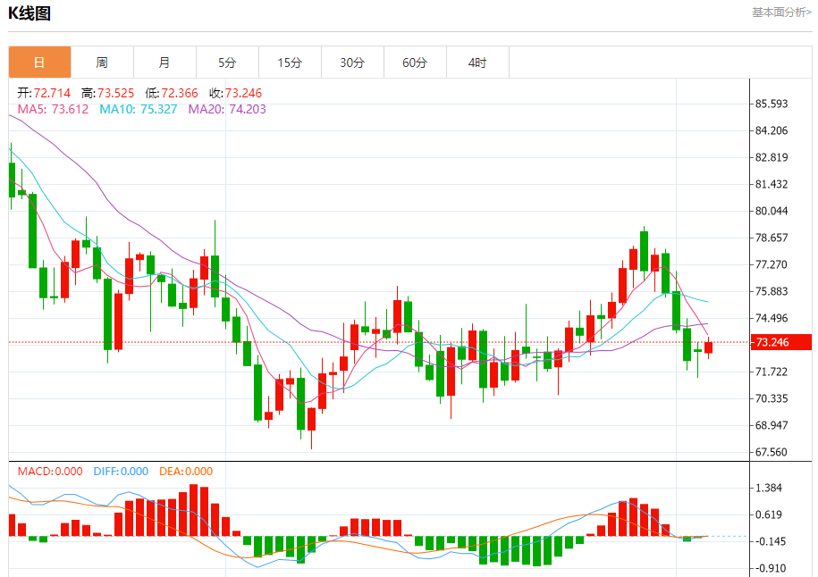 周二盘中,WTI原油报73.306,涨幅0.71%。