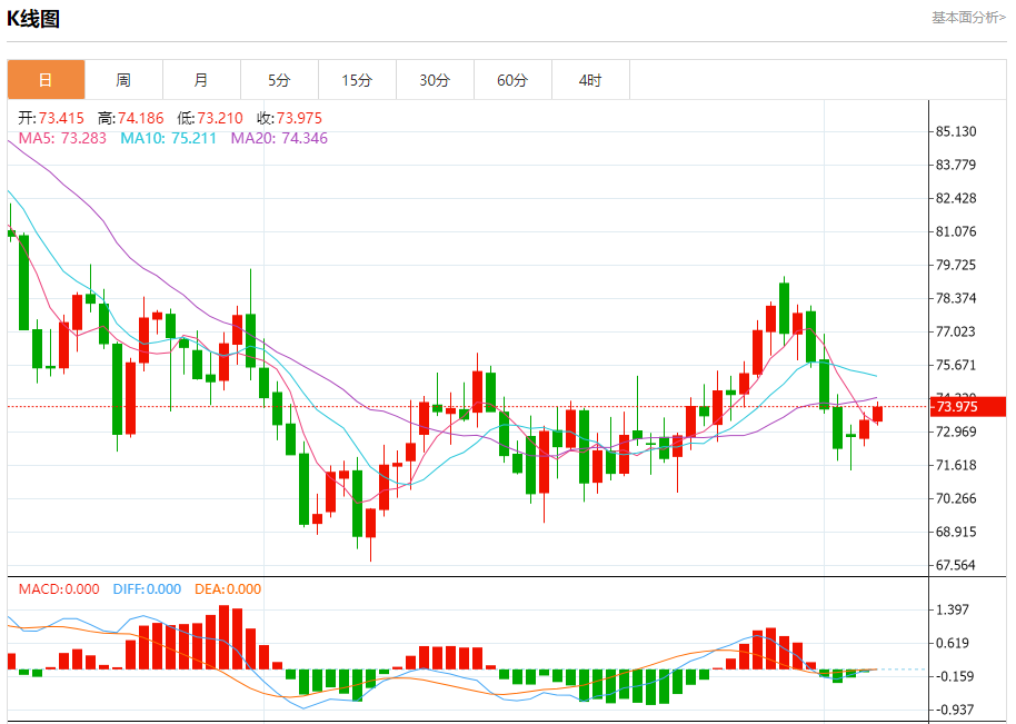 周三盘中,WTI原油报73.904,涨幅0.64%。