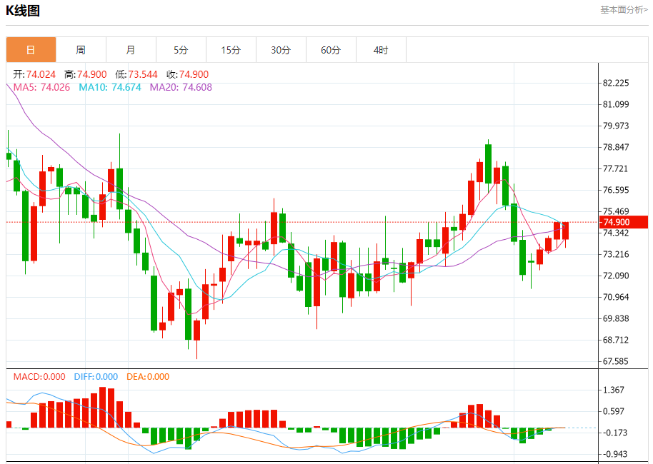 周四盘中,WTI原油报74.894,涨幅1.12%。