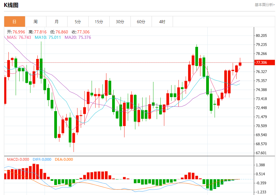 周二盘中,WTI原油报77.356,涨幅0.57%。