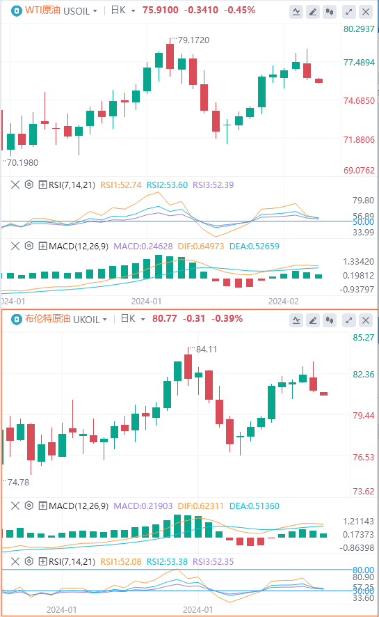周三的回调使WTI原油在77.40美元附近的200日均线上形成了一个看跌阻力,WI原油有可能继续在200日均线和73.55美元附近的50日均线之间的盘整区间内震荡。