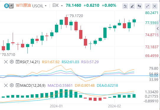 日K线显示,WTI有望稳稳突破200日均线77.45美元附近的高位,但多头需要明确突破1月份的高点79.20美元,然后才能在80.00美元处盘口运行。