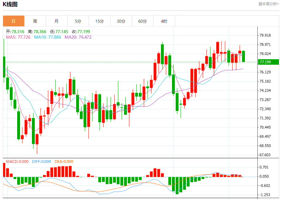 周五盘中,WTI原油报77.114,跌幅1.55%。
