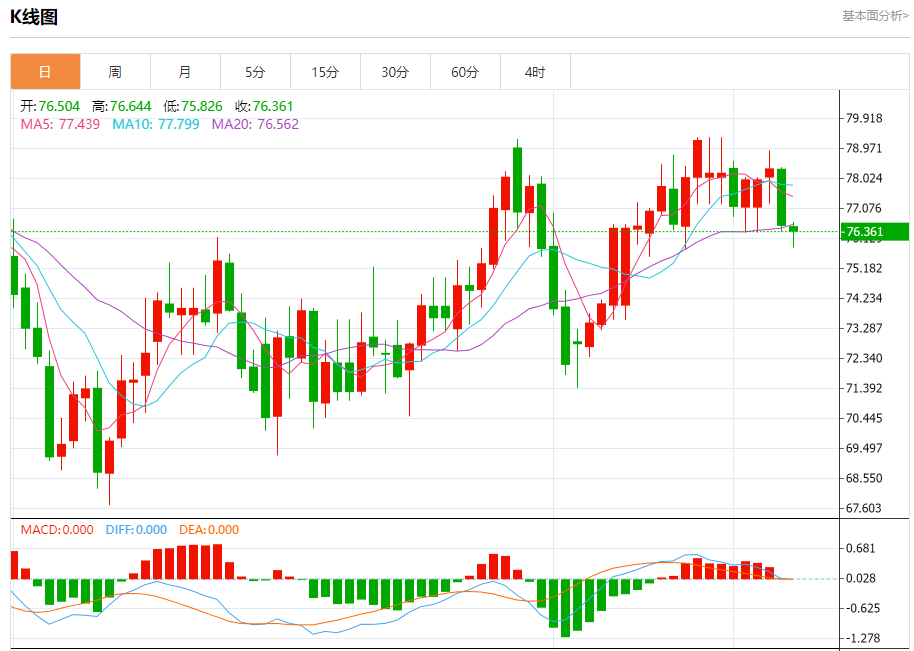 周一盘中,WTI原油报76.405,跌幅0.18%。
