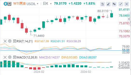 油价周五上涨2%,并录得周涨幅,因交易商等待OPEC+就第二季度供应协议做出决定,同时也在权衡美国、欧洲和中国的最新经济数据。5月份布伦特LCOc1期货结算价上涨1.64美元,即2%,至每桶83.55美元。4月布伦特原油期货合约于2月29日到期,价格为每桶83.62美元。4月份美国西德克萨斯中质原油(WTI)CLc1上涨1.71美元,涨幅2.19%,至每桶79.97美元。本周,布伦特原油在合约月份转换后上涨约2.4%,而WTI上涨超过4.5%。
