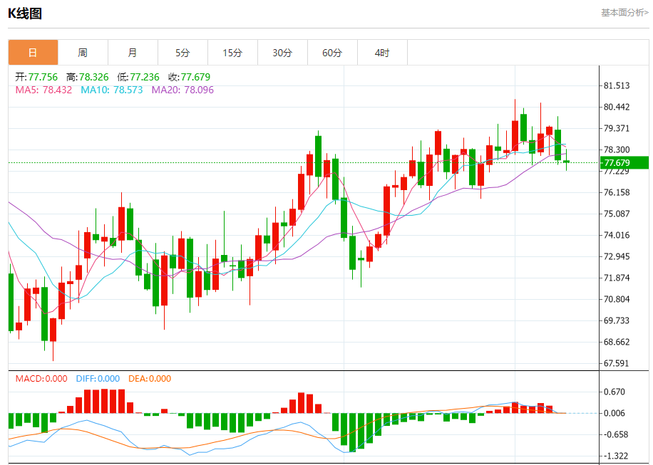 周一盘中,WTI原油报77.690,跌幅0.11%。