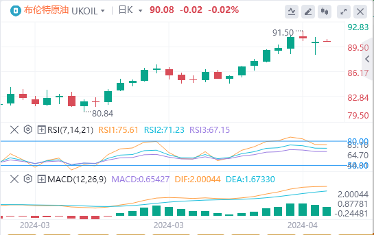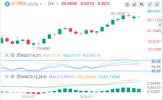 美元走软和中东冲突持续的地缘政治紧张局势引发了对原油供应中断的担忧,推动WTI价格接近六个月高点。截至目前,WTI原油报价85.89美元,Brent原油报价90.08美元。