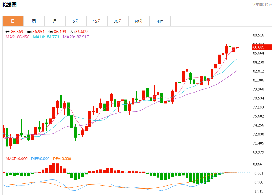 周二盘中,WTI原油报86.619,涨幅0.08%。