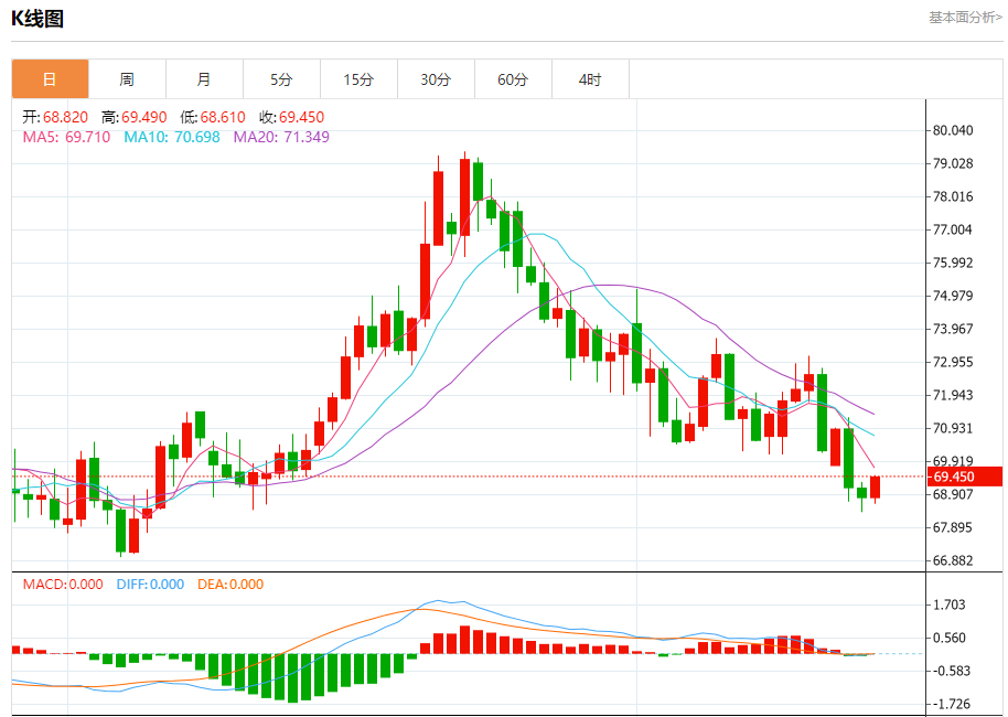 周四盘中,WTI原油报69.310,涨幅1.06%。