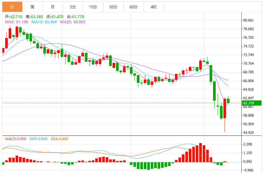 周四(4月10日),美原油价格交投于61.790美元/桶附近,跌幅为0.90%。