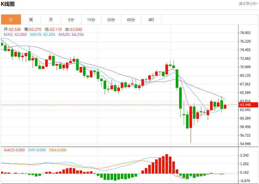周四盘中,WTI原油报63.010,涨幅1.19%。