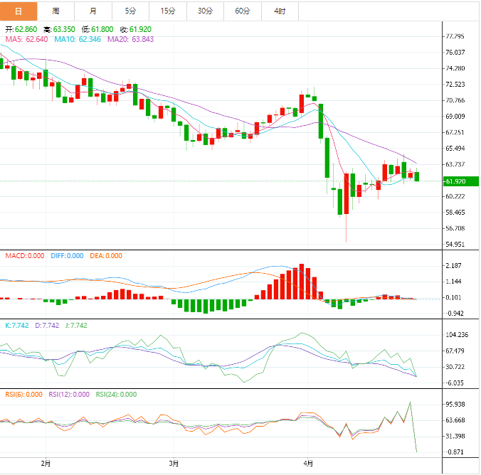 4 月 25 日,Economies.com的分析师称,WTI 原油期货价格在日内交易中略有上涨,因稳定保持在 50 日指数移动平均线上方,弥补了部分之前损失。尽管有日内上涨,但价格受短期楔形形态影响,且在进入超买区域后相对强弱指数(RSI)出现负向重叠信号,卖压可能性增强。若原油价格稳定在 63.20 美元下方,即将到来的日内交易中将下跌,目标是 61.50 美元支撑位,且准备跌破该支撑位,预期交易区间在 64.40 美元支撑位和 66.90 美元阻力位之间,今日预测为看跌。
