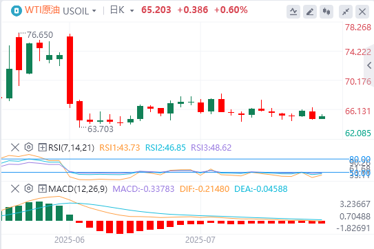原油价格为65.20美元,测试上升趋势线和水平底部64.95美元附近的关键支撑位。价格仍低于50日均线(65.87美元)和100日均线(66.22美元),反映出短期看跌压力。